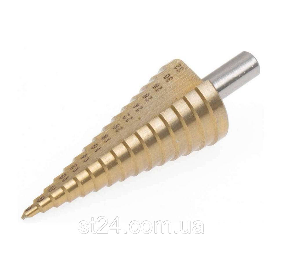 Матеріал: швидкорізальна сталь HSS з титановим покриттям 15 ступенів з діаметрами: 4-6-8-10-12-14-16-18-20-22-24-26-28-30-32 мм.