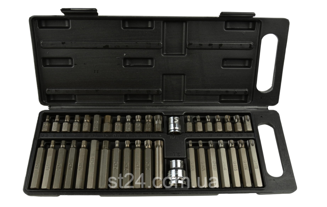 Набір доліт із сталі CrV, використовується для ослаблення спеціальних гвинтів: torx, spline, hex. Завдяки великій різноманітності біт, цей набір ідеально підходить для професійних послуг та автосервісів.
